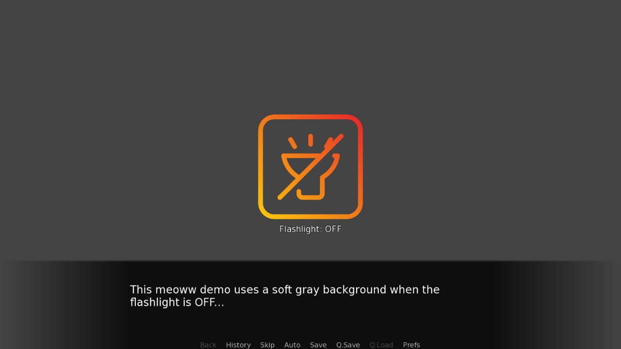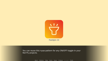 To make the user interface feel more immersive, the background color also reacts to the toggle. When the flashlight is OFF, the demo shows a soft neutral gray suited for horror games, puzzle scenes or any dark atmosphere. When the flashlight is ON, the scene fades to a gentle pastel yellow glow, nyaa! This Ren’Py example is a solid starting point for PC and mobile visual novels.