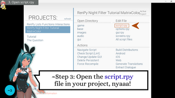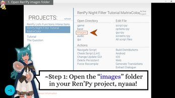 Locate and open script.rpy sooo you can define the meoww image and transform it with MatrixColor, fufufu!