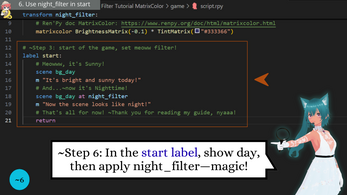 Thank you sooo much for following along with me on this little coding adventure. Now you know how to cast your MatrixColor night filter spell in Ren’Py—turning day into night with pure code magic, no extra assets required, fufufu!